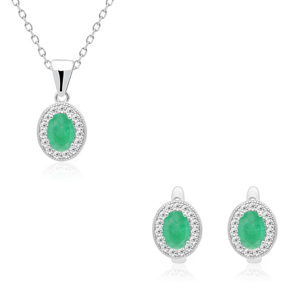 Komplet srebrny ozdobiony szmaragdem i cyrkoniami – kolczyki z zawieszką wykonany z najwyższej próby srebra 925 – bez niklu, nie uczula. Biżuteria dodatkowo pokryta 3 warstwami szlachetnego rodu. Długość kolczyków: 13mm. Długość zawieszki: 19mm. Biżuteria ozdobiona naturalnymi szmaragdami o szlifie owalnym o wielkości 5x7mm oraz cyrkoniami. Wyrób jubilerski wysokiej jakości wykonany przez mistrzów jubilerstwa z ogromną precyzją oraz dbałością o detale.