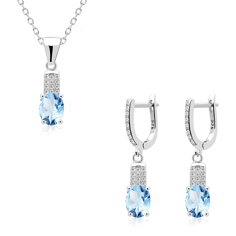 Komplet srebrny z niebieskim topazem oraz cyrkoniami – kolczyki z zawieszką wykonany z najwyższej próby srebra 925 – bez niklu, nie uczula. Biżuteria dodatkowo pokryta 3 warstwami szlachetnego rodu. Długość kolczyków: 30mm. Długość zawieszki: 14mm. Biżuteria ozdobiona naturalnymi niebieskimi topazami o szlifie owalnym o wielkości 7x9mm oraz cyrkoniami. Wyrób jubilerski wysokiej jakości wykonany przez mistrzów jubilerstwa z ogromną precyzją oraz dbałością o detale.
