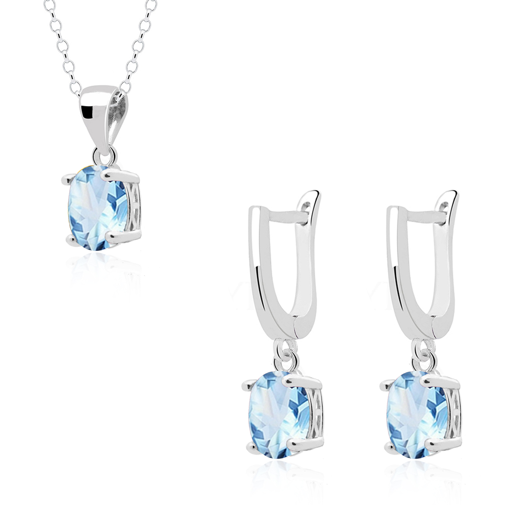 Komplet srebrny z niebieskim topazem – kolczyki z zawieszką wykonany z najwyższej próby srebra 925 – bez niklu, nie uczula. Biżuteria dodatkowo pokryta 3 warstwami szlachetnego rodu. Długość kolczyków: 23mm. Długość zawieszki: 15mm. Biżuteria ozdobiona naturalnymi niebieskimi topazami o szlifie owalnym o wielkości 6x8mm. Wyrób jubilerski wysokiej jakości wykonany przez mistrzów jubilerstwa z ogromną precyzją oraz dbałością o detale.