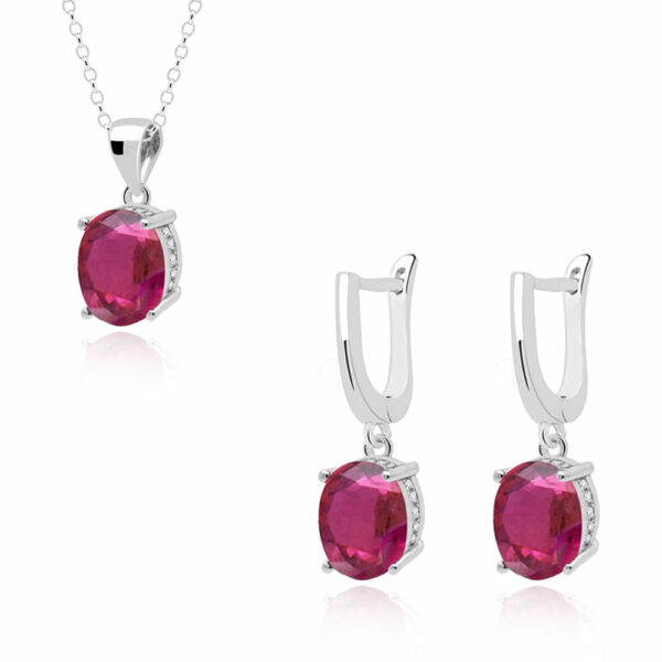 Komplet srebrny z rubinami i delikatnymi cyrkoniami wykonany z najwyższej próby srebra 925 – bez niklu, nie uczula. Biżuteria dodatkowo pokryta 3 warstwami szlachetnego rodu. Długość kolczyków: 27mm. Długość zawieszki: 17mm. Biżuteria ozdobiona naturalnymi rubinami o szlifie owalnym o wielkości 8x10mm oraz cyrkoniami. Wyrób jubilerski wysokiej jakości wykonany przez mistrzów jubilerstwa z ogromną precyzją oraz dbałością o detale.