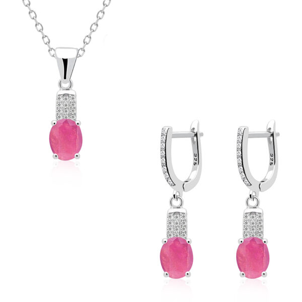 Komplet srebrny z rubinami oraz cyrkoniami – kolczyki z zawieszką wykonany z najwyższej próby srebra 925 – bez niklu, nie uczula. Biżuteria dodatkowo pokryta 3 warstwami szlachetnego rodu. Długość kolczyków: 30mm. Długość zawieszki: 14mm. Biżuteria ozdobiona naturalnymi rubinami o szlifie owalnym o wielkości 7x9mm oraz cyrkoniami. Wyrób jubilerski wysokiej jakości wykonany przez mistrzów jubilerstwa z ogromną precyzją oraz dbałością o detale.
