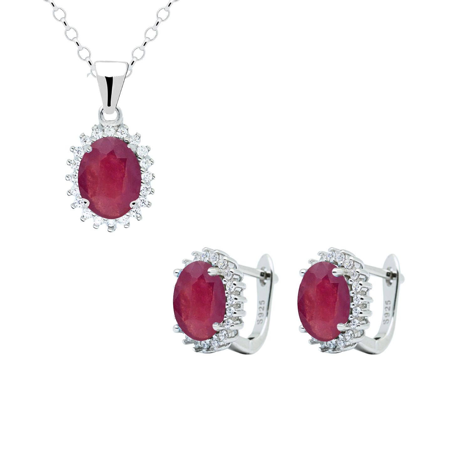 Komplet srebrny z rubinem to elegancka biżuteria składająca się z zawieszki oraz kolczyków typu angielskiego. Owalny, fasetowany rubin otoczony jest aureolą z drobnych, lśniących kamieni, które podkreślają jego głęboką barwę. Wykonano ze srebra próby 925 i pokryto rodem, dzięki czemu komplet zachwyca blaskiem i ponadczasową klasą. Idealny na prezent i wyjątkowe okazje.