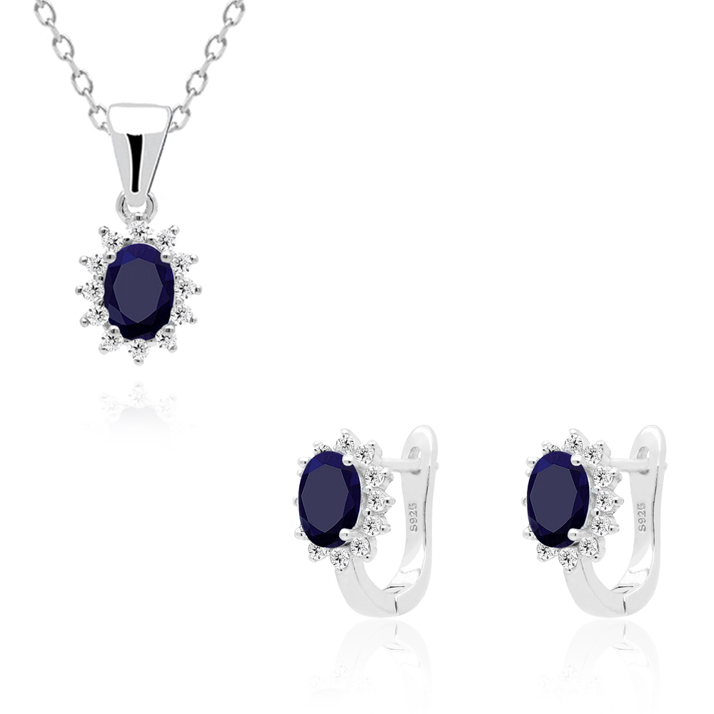 Komplet srebrny ozdobiony szafirami i cyrkoniami – kolczyki z zawieszką wykonany z najwyższej próby srebra 925 – bez niklu, nie uczula. Biżuteria dodatkowo pokryta 3 warstwami szlachetnego rodu. Długość kolczyków: 13mm. Długość zawieszki: 19mm. Biżuteria ozdobiona naturalnymi szafirami o szlifie owalnym o wielkości 5x7mm oraz cyrkoniami. Wyrób jubilerski wysokiej jakości wykonany przez mistrzów jubilerstwa z ogromną precyzją oraz dbałością o detale.