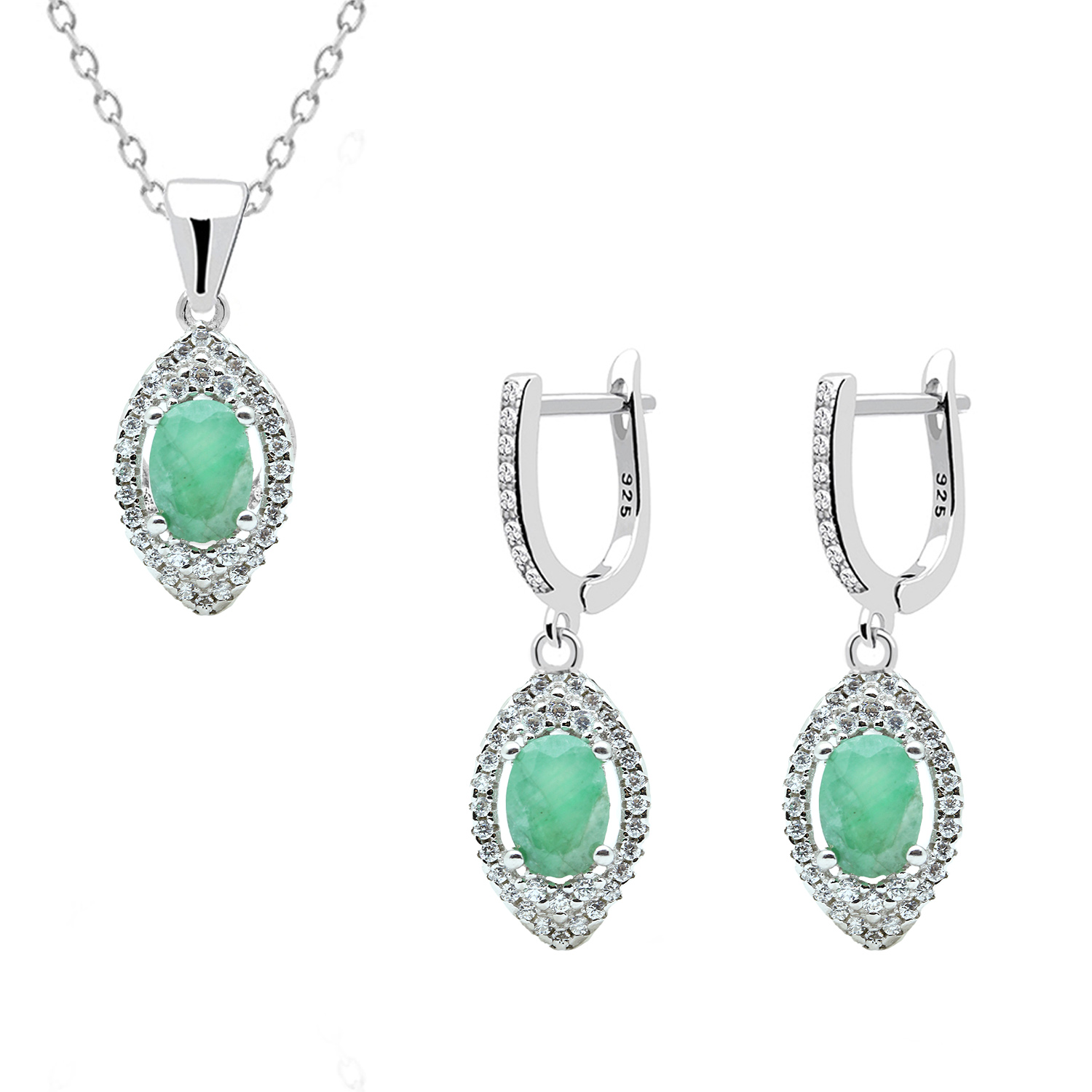Komplet srebrny z szmaragdem to wyrafinowana biżuteria łącząca zawieszkę i wiszące kolczyki. Centralny, markizowy szmaragd otoczony halo z cyrkonii olśniewa blaskiem. Wysokopolerowane srebro i zapięcie angielskie gwarantują elegancję i komfort noszenia.
