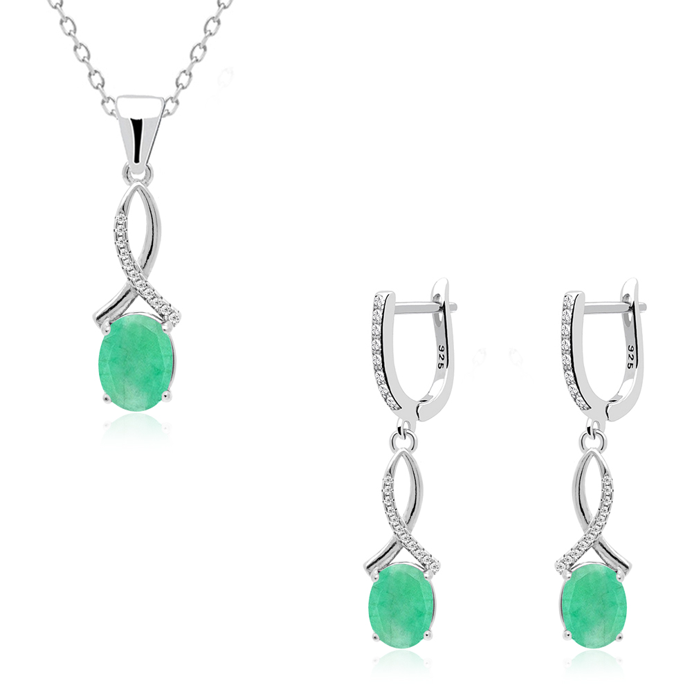 Komplet srebrny ze szmaragdami i cyrkoniami – kolczyki z zawieszką wykonany z najwyższej próby srebra 925 – bez niklu, nie uczula. Biżuteria dodatkowo pokryta 3 warstwami szlachetnego rodu. Długość kolczyków: 27mm. Długość zawieszki: 29mm. Biżuteria ozdobiona naturalnymi szmaragdami o szlifie owalnym o wielkości 7x9mm oraz cyrkoniami. Wyrób jubilerski wysokiej jakości wykonany przez mistrzów jubilerstwa z ogromną precyzją oraz dbałością o detale.