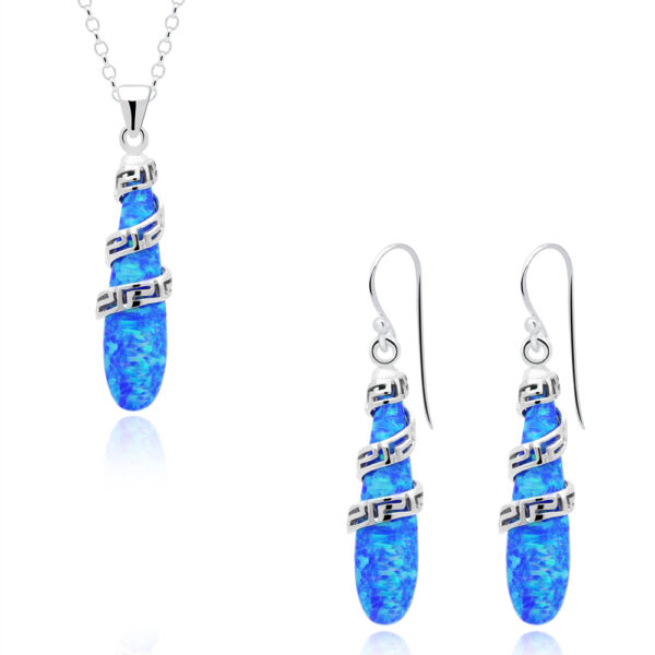 Komplet z niebieskim opalem zawijasy srebrny – kolczyki z zawieszką