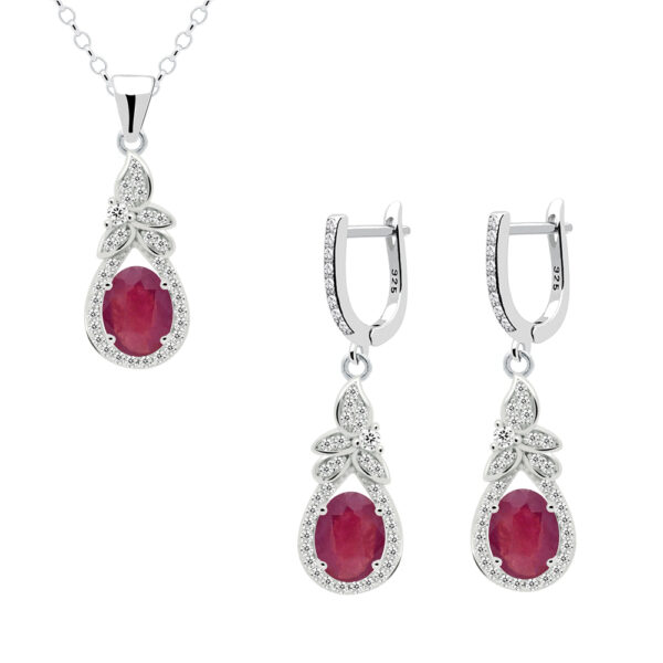 Komplet z rubinem srebrny listki z cyrkonią – kolczyki z zawieszką