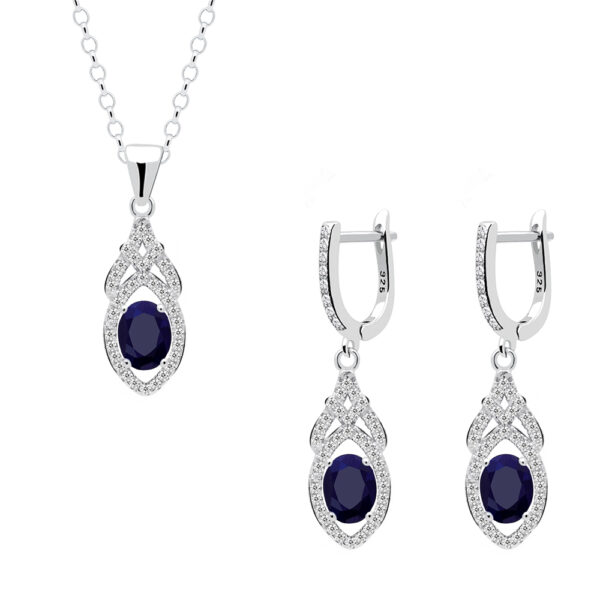Komplet z szafirem i cyrkoniami srebrny – kolczyki z zawieszką. Biżuteria wykonana z najwyższej próby srebra 925 – bez niklu, nie uczula. Komplet dodatkowo pokryty 3 warstwami szlachetnego rodu. Długość kolczyków: 34mm. Długość zawieszki: 26mm. Biżuteria ozdobiona naturalnym szafirem o szlifie owalnym o wielkości 5x7mm oraz cyrkoniami o szlifie brylantowym o przejrzystości: AAAAA+, klasa pierwsza. Wysokiej klasy cyrkonia nadaje delikatny błyszczący efekt. Wyrób jubilerski wysokiej jakości wykonany przez mistrzów jubilerstwa z ogromną precyzją oraz dbałością o detale.