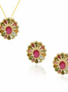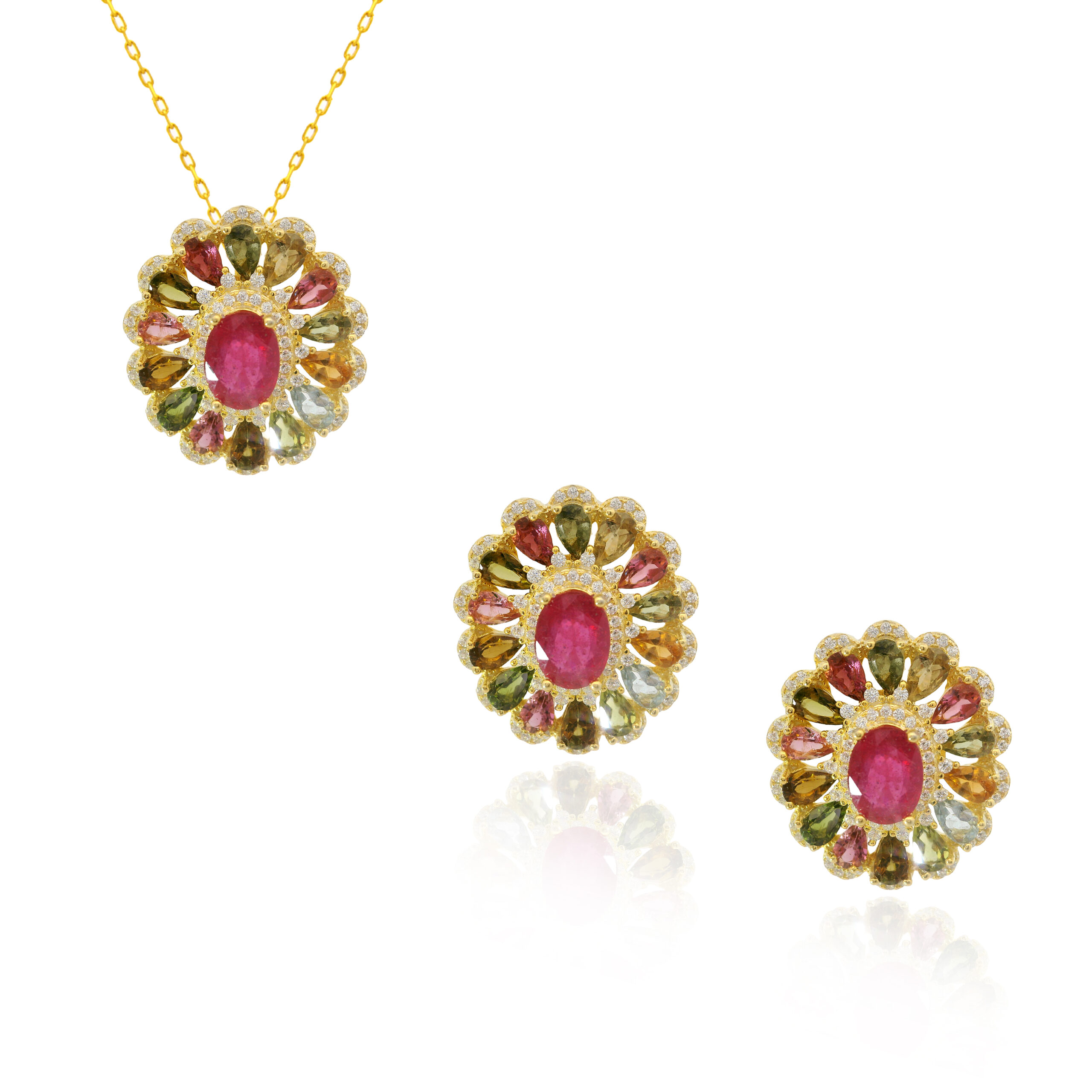 Komplet z turmalinami oraz rubinem srebro pozłacane wykonany z najwyższej próby srebra 925 – bez dodatku niklu, nie uczulają. Komplet pokryty 3 warstwami 24 karatowego złota. Wielkość kolczyków: 20×25 mm. Wielkość zawieszki: 23×25 mm. Wyrób jubilerski wykonany z ogromną precyzją przez mistrzów jubilerstwa.