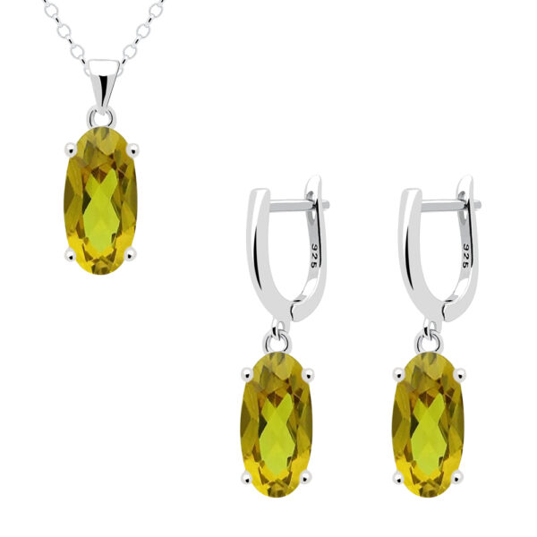 Komplet, Kolczyki oraz Zawieszka wykonane z najwyższej Próby Srebra 925 – bez niklu, nie uczula. Biżuteria pokryta 3 warstwami szlachetnego Rodu. Długość kolczyków wraz zapięciem: 33 mm. Długość zawieszki: 23 mm. Wielkość Kamieni: 16×8 mm. Komplet ozdobiony ekskluzywnym kamieniem Zultanitem. Kamień ten jest rzadki i występuje tylko w Anatolii w Turcji. Zultanit zmienia kolor w zależności od kąta padania światła – inną barwę ma w świetle dziennym, inną w pomieszczeniach, co sprawia, że kamień może zmienić kolor kilka razy dziennie. O niezwykłości kamienia świadczy również występujące w zultanicie zjawisko „kociego oka”- efekt odbicia, który pojawia się jako jedno jasne pasmo światła na całej powierzchni kamienia.