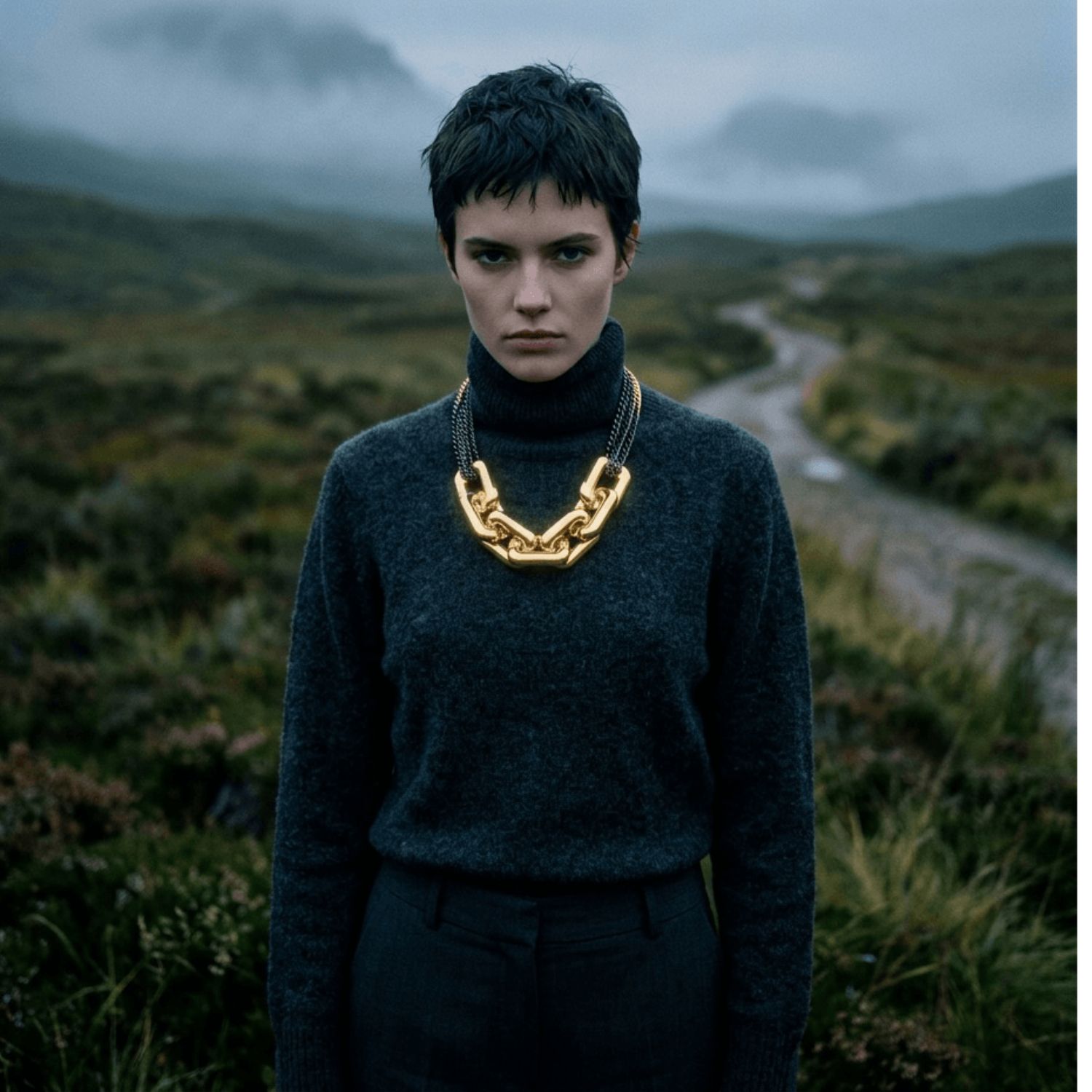 Projekt ten wyróżnia się konsekwencją w budowaniu napięcia wizualnego – od ciężkiego, złoconego centrum po lekką, dynamiczną strukturę kaskadowych łańcuchów. Każdy element został zaprojektowany z uwzględnieniem zarówno walorów estetycznych, jak i ergonomii użytkowania. To biżuteria, która nie tylko zdobi, ale również komunikuje świadomy wybór stylu opartego na jakości, technologii i wyrazistej formie.