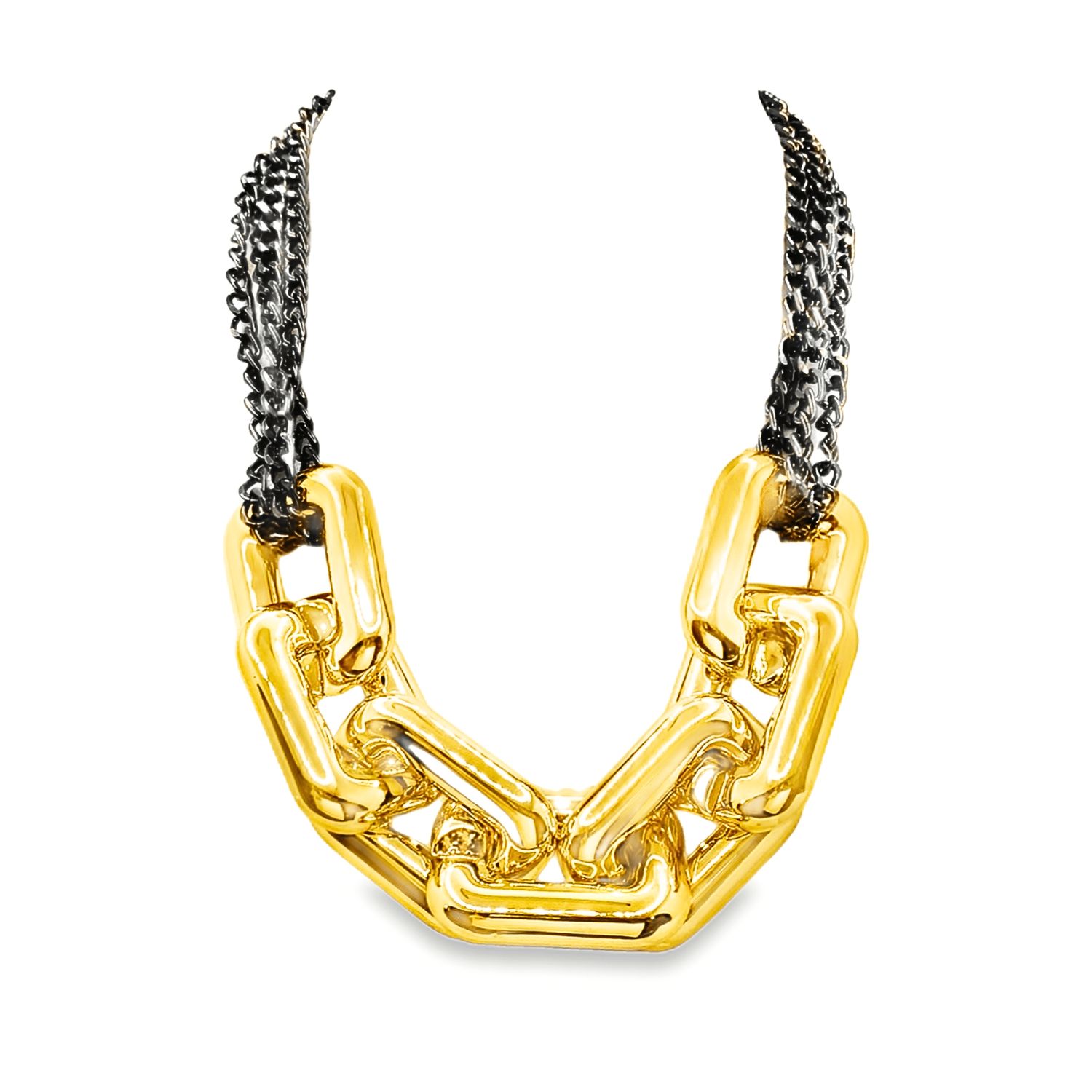Masywny naszyjnik kaskadowy z grubych ogniw – stal szlachetna to nowoczesna forma biżuterii o wyrazistym charakterze. Złocony segment z siedmiu masywnych ogniw kontrastuje z trzema rzędami ciemnych łańcuchów o splocie pancerki. Precyzyjne wykonanie, lustrzany połysk i kaskadowa konstrukcja tworzą spójną, dynamiczną kompozycję.
