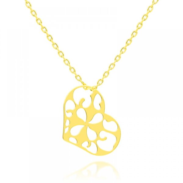 Naszyjnik z kolekcji „Celebrytka” wykonany ze srebra próby 925 oraz pokryty warstwą 24 karatowego złota. Naszyjnik z zawieszka w kształcie ażurowego serduszka. Ten delikatny naszyjnik z kolekcji „Celebrytka” idealnie podkreśla kobiecą subtelność oraz piękno. Naszyjnik ten nadaje się do codziennych stylizacji oraz na wieczorne wyjścia. Wielkość zawieszki 10×10 mm. Długość naszyjnika 42-44 cm.