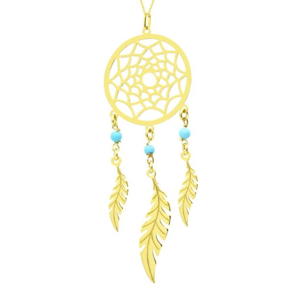 Naszyjnik w kształcie łapacza snów, wykonany ze srebra próby 925. Biżuteria dodatkowo pokryta warstwą 24 karatowego złota. Wielkość zawieszki: 25×80 mm. Długość łańcuszka 45 cm. Łapacz snów który przez wielu uznawany jest za swoisty amulet, pochodzi z Ameryki Południowej. To właśnie plemienni Indianie wymyślili i tworzyli łapacze snów, którym przypisywali tajemną moc ochrony przed złymi snami oraz wszelkimi negatywnymi mocami.
