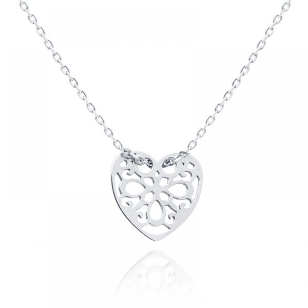 Naszyjnik z kolekcji „Celebrytka” wykonany ze srebra uszlachetnionego rodem próby 925. Naszyjnik z zawieszka w kształcie ażurowego serduszka. Ten delikatny naszyjnik z kolekcji „Celebrytka” idealnie podkreśla kobiecą subtelność oraz piękno. Naszyjnik ten nadaje się do codziennych stylizacji oraz na wieczorne wyjścia. Wielkość zawieszki 10×10 mm. Długość naszyjnika 41-44 cm.