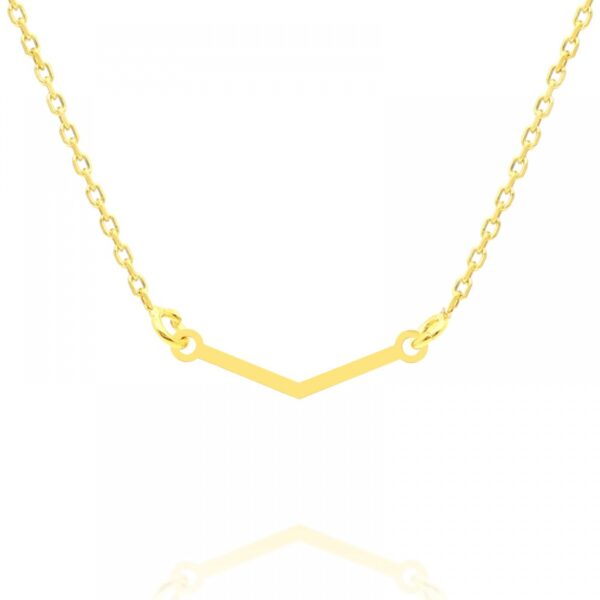 Naszyjnik z zawieszką w kształcie litery V. Naszyjnik wykonany ze srebra próby 925, dodatkowo pokryty 24 karatowym złotem. Wielkość zawieszki 20×5 mm. Długość naszyjnika 42-45 cm.