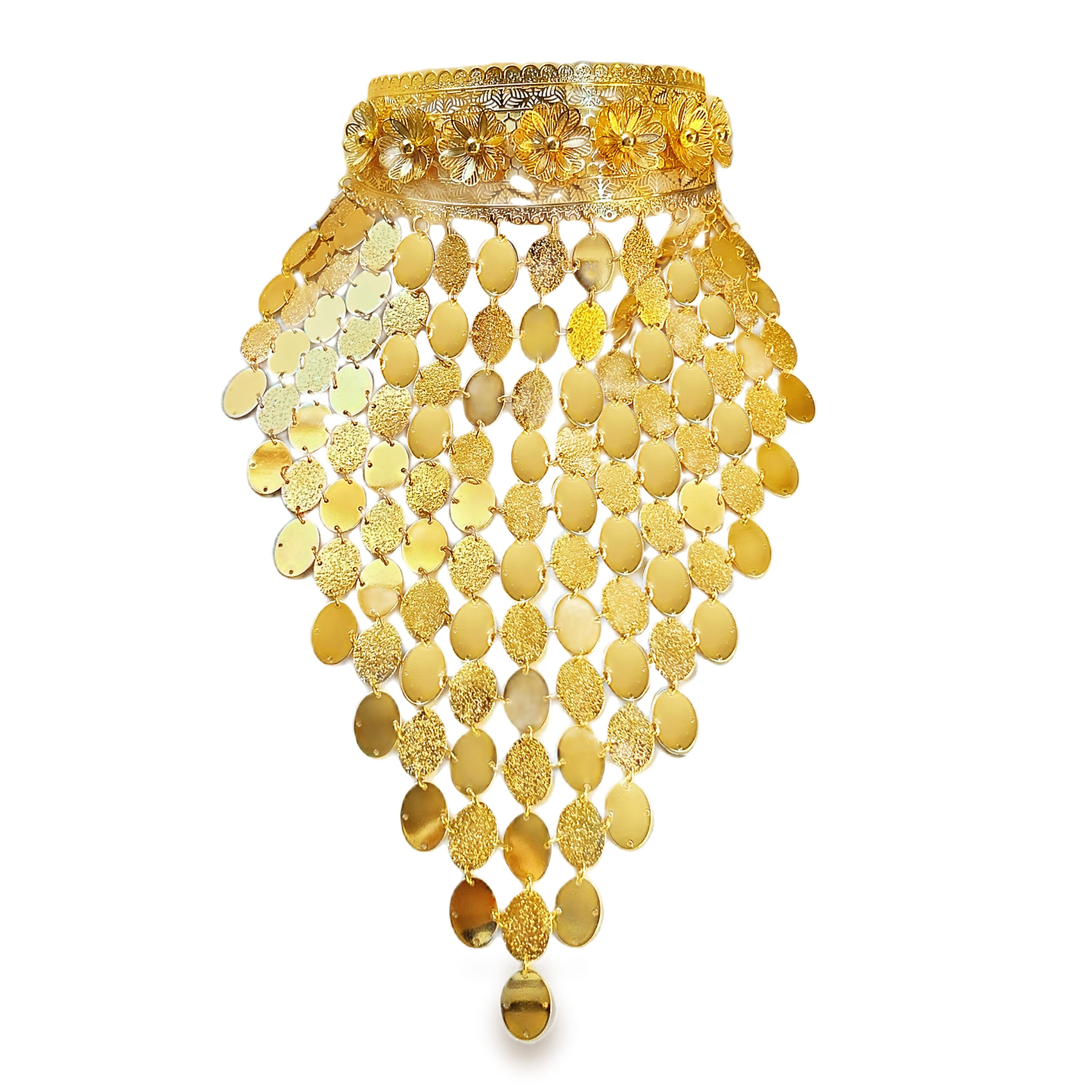 Bogato zdobiona obręcz z misternym wzorem kwiatów przechodzi w kaskadę dużych, lśniących i fakturowanych blaszek, które układają się w imponującą, trójkątną formę. Każdy ruch sprawia, że naszyjnik pięknie mieni się światłem, tworząc niezwykle efektowną, dynamiczną całość.