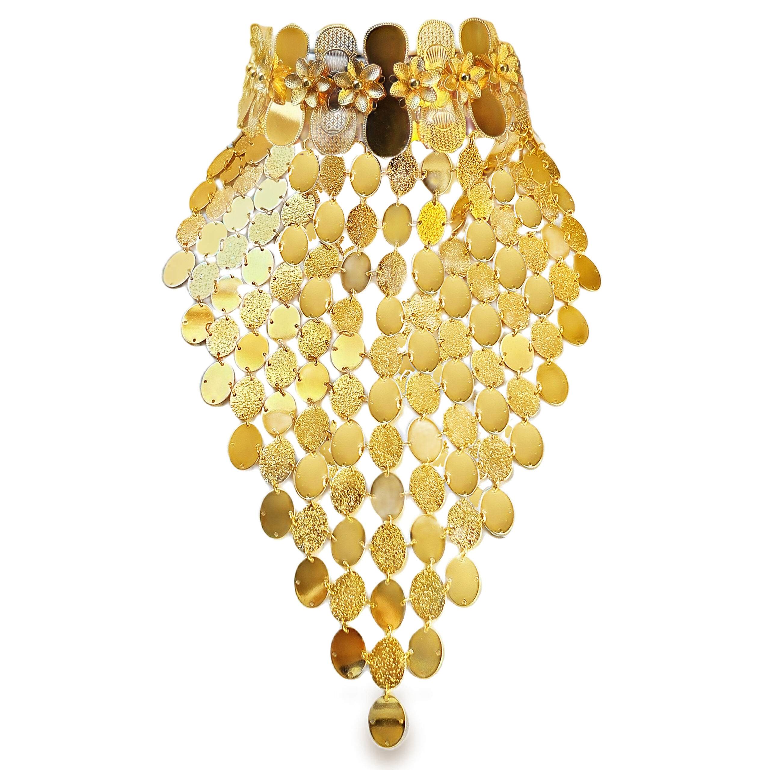Bogato zdobiona obręcz z misternym wzorem kwiatów przechodzi w kaskadę dużych, lśniących i fakturowanych blaszek, które układają się w imponującą, trójkątną formę. Każdy ruch sprawia, że naszyjnik pięknie mieni się światłem, tworząc niezwykle efektowną, dynamiczną całość.