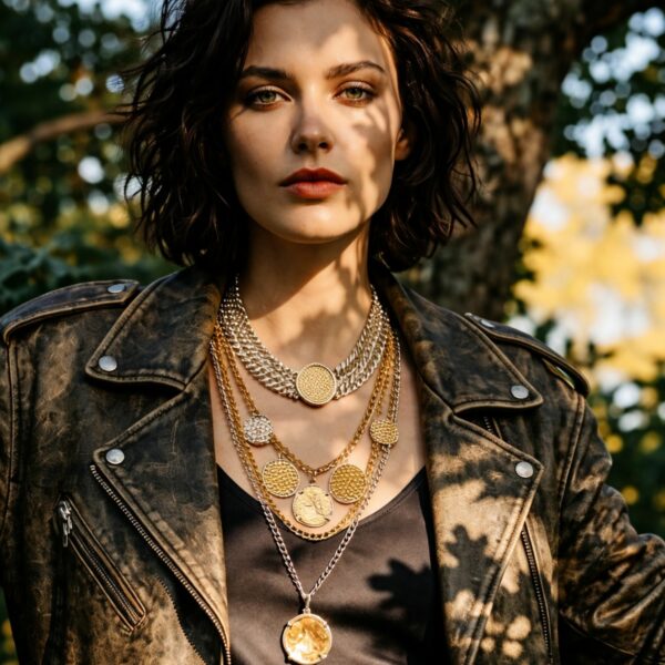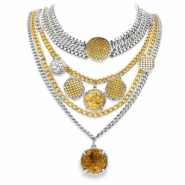 Naszyjnik kaskadowy Vintage – stal szlachetna to wielowarstwowa kompozycja z czterech rzędów łańcuchów o zróżnicowanych splotach. Centralna bizą z heksagonalnym wzorem oraz siedem dekoracyjnych medalionów nadają mu wyrazisty charakter. Kontrast stali i złocenia PVD podkreśla nowoczesną interpretację klasycznej formy.