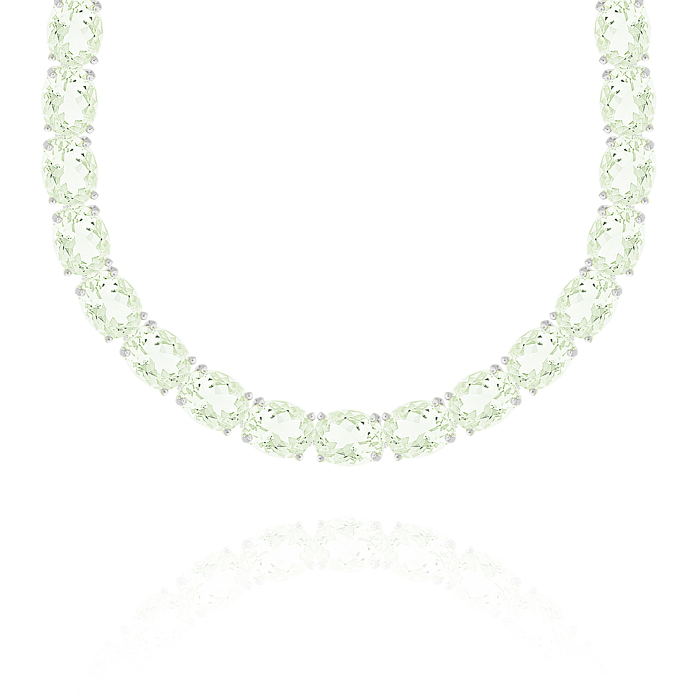 Naszyjnik kolia wysadzana jasnymi zielonymi ametystami srebrna unikatowa wykonana z wysokiej próby srebra 925 – bez dodatku niklu, nie uczula. Biżuteria dodatkowo pokryta 3 warstwami szlachetnego rodu. Długość naszyjnika regulowana:44,5-51,5cm. Naszyjnik bogato ozdobiony 33 kamieniami naturalnymi zielonymi ametystami o rzadko spotykanym szlifie owalnym o wymiarach: 10x12mm.