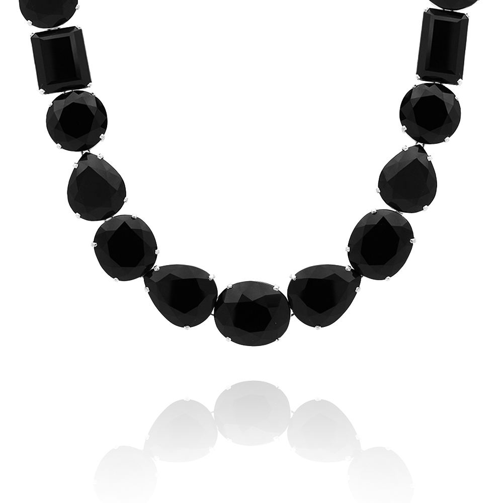 Naszyjnik kolia wysadzana onyksami srebrna wykonana z wysokiej próby srebra 925 – bez dodatku niklu, nie uczula. Biżuteria  dodatkowo pokryta 3 warstwami szlachetnego rodu. Długość naszyjnika regulowana: 46-53,5cm. Naszyjnik bogato ozdobiony kamieniami naturalnymi czarnymi onyksami o szlifach: okrągły: 20x20mm, owalny: 18x19mm, 18x22mm, 20x24mm, migdał: 19×22, 19x23mm, 19x26mm, szmaragd: 16x22mm, 14x24mm.