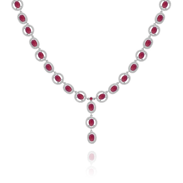 Naszyjnik kolia wysadzana rubinami oraz cyrkoniami srebrna wykonana z wysokiej próby srebra 925 – bez dodatku niklu, nie uczula. Biżuteria dodatkowo pokryta 3 warstwami szlachetnego rodu. Długość naszyjnika regulowana: 45-50 cm. Naszyjnik bogato ozdobiony kamieniami naturalnymi rubinami o szlifie owal o wymiarach: 5×7 mm. Wyrób jubilerski wysokiej jakości wykonany przez mistrzów jubilerstwa z ogromną precyzją oraz dbałością o detale.