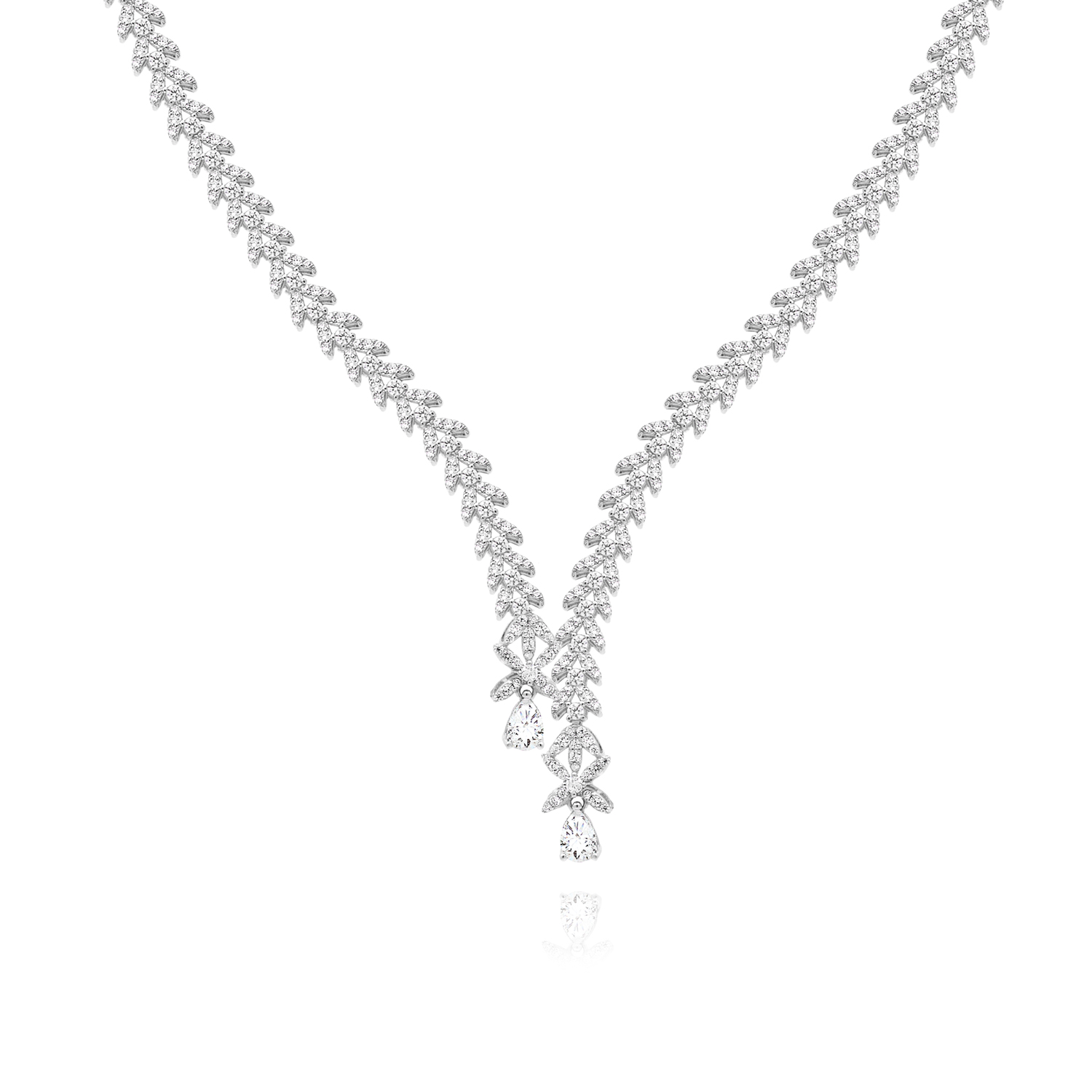 Naszyjnik kolia wysadzania białymi cyrkoniami srebrna wykonany z najwyższej próby srebra 925 – bez niklu, nie uczula. Biżuteria dodatkowo pokryta 3 warstwami szlachetnego rodu. Długość naszyjnika: 46-51cm, długość elementu wiszącego: 2,8cm. Kolia ozdobiona cyrkoniami o szlifie brylantowym o przejrzystości: AAAAA+, klasa pierwsza. Wysokiej klasy cyrkonia nadaje delikatny błyszczący efekt. Wyrób jubilerski wysokiej jakości wykonany przez mistrzów jubilerstwa z ogromną precyzją oraz dbałością o detale.
