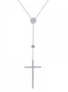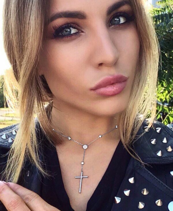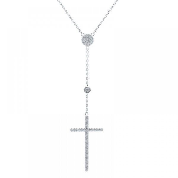 Naszyjnik typu choker wykonany ze srebra próby 925, dodatkowo uszlachetniony rodem. Długość chokera 35-40 cm. Długość przedłużenia: 7 cm. Wielkość krzyżyka: 35×18 mm.