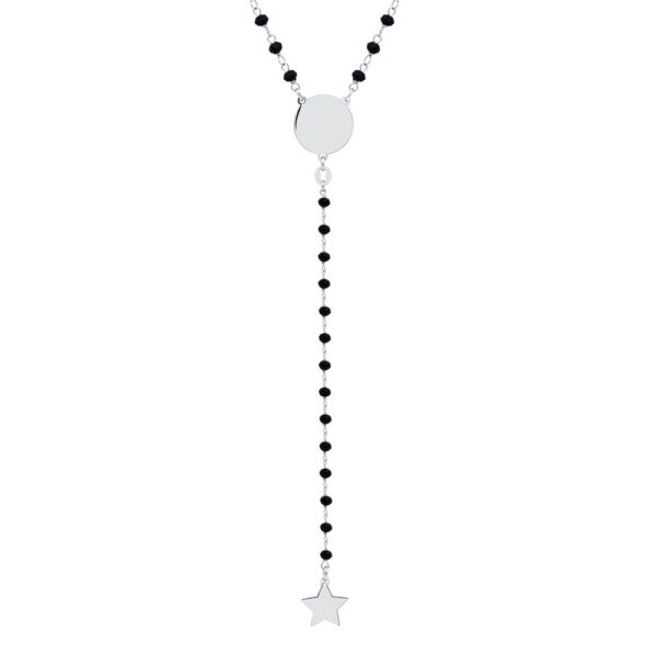 Naszyjnik wykonany ze srebra próby 925, dodatkowo pokryty warstwą rodu. Długość łańcuszka: 110 cm. Naszyjnik można zawinąć wokół szyi. Naszyjnik ozdobiony koralikami Swarovski. Długość przedłużenia łącznie z gwiazdką: 12 cm. Średnica kółeczka: 10 mm. Wielkość gwiazdki: 13 x 15 mm. Średnica koralików 3 mm.