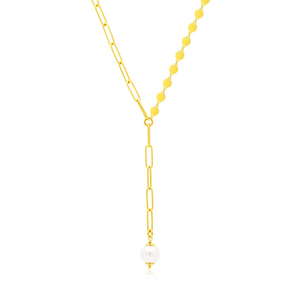 Naszyjnik krawatka z perłą swarovskiego srebrny pozłacany wykonany z najwyższej próby srebra 925 – bez dodatku niklu, nie uczula. Biżuteria modowa pokryta 3 warstwami 24 karatowego złota. Długość naszyjnika 45,5 – 50cm. Długość elementu wiszącego: 64mm. Precioza ozdobiona perłą swarovskiego. Wyrób jubilerski o bardzo unikatowym wzorze wykonany z ogromną precyzją oraz mistrzowskim kunsztem w każdym detalu.