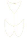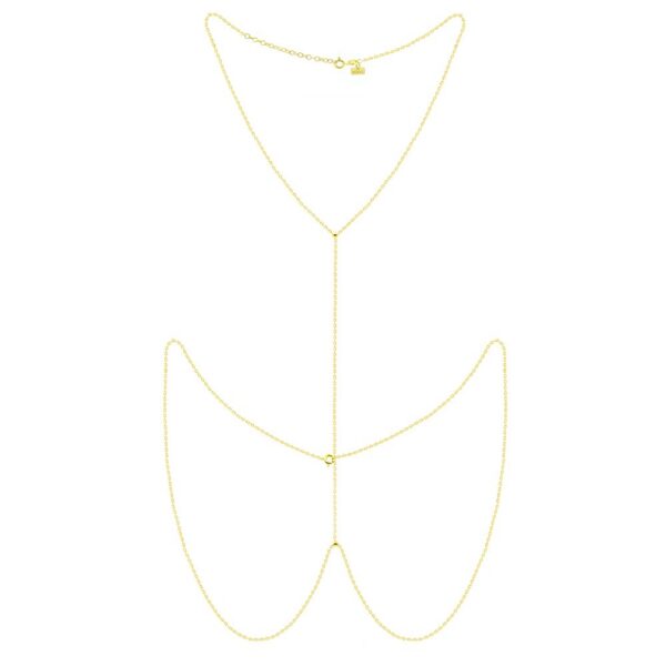 Naszyjnik na ciało inaczej Body Chain, wykonany ze srebra próby 925 oraz pokryty warstwą 24 karatowego złota. Ta biżuteria zachwyca nie tylko oryginalnym sposobem noszenia, lecz także nowoczesną formą. Długość naszyjnika na szyje: 41-45cm. Długość części łączącej: 23 cm. Długość naszyjnika na biodra: 75 cm.