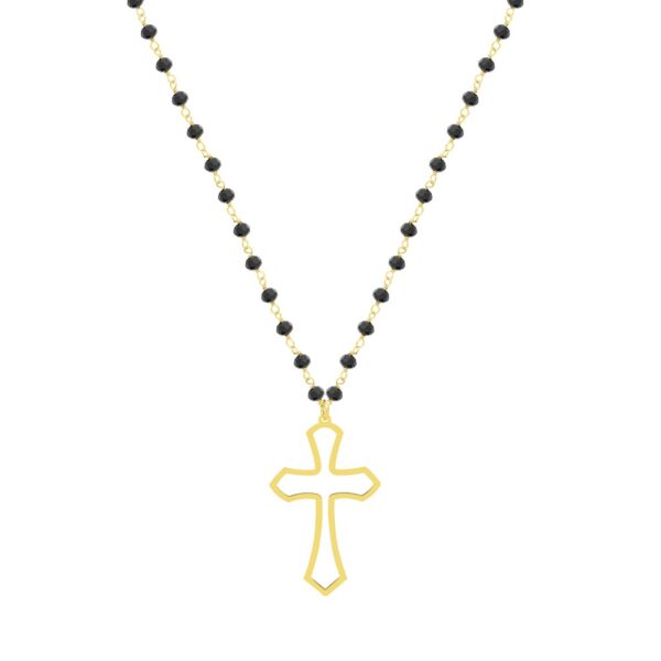 Naszyjnik wykonany ze srebra próby 925, dodatkowo pokryty warstwą 24 karatowego złota. Naszyjnik można zawinąć wokół szyi. Obwód łańcuszka: 110 cm. Wielkość krzyża: 37×25 mm. Średnica koralików: 3 mm. Różaniec idealnie podkreśli charakter stylizacji. Modny dodatek każdej kobiety w każdym sezonie. Różańce stanowią znakomite dopełnienie waszej kolekcji biżuterii.