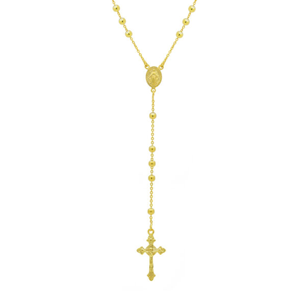 Różaniec- naszyjnik z religijnym akcentem, wykonany ze srebra próby 925. Różaniec dodatkowo uszlachetniony warstwą 24 karatowego złota. Obwód różańca: 60 cm. Wielkość krzyżyka 15×30 mm. Wielkość medalika: 10×10 mm. Różaniec stanowi idealne dopełnienie Twojej kolekcji biżuterii. Naszyjnik ten podkreśli Twoją stylizację nadając jej wyjątkowego charakteru.