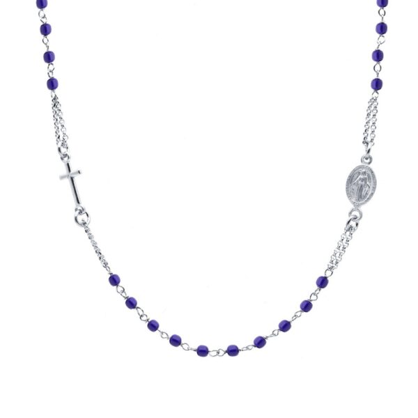 Różaniec- naszyjnik z religijnym akcentem, wykonany ze srebra próby 925, dodatkowo uszlachetniony warstwą rodu. Różaniec inspirowany domem mody Dolce&Gabbana. Długość naszyjnika 45-49 cm. Wielkość medalika oraz krzyżyka 1×1 cm. Różaniec ozdobiony niebieskimi koralikami. Różaniec stanowi idealne dopełnienie Twojej kolekcji biżuterii. Naszyjnik ten podkreśli Twoją stylizację nadając jej wyjątkowego charakteru.