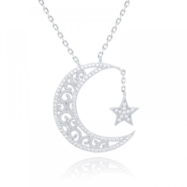 Naszyjnik ozdobiony białą cyrkonią, wykonany ze srebra uszlachetnionego rodem próby 925. Naszyjnik w kształcie księżyca z gwiazdką. Wielkość ozdobnej zawieszki: 30×25 mm. Długość naszyjnika regulowana: 42-45 cm.