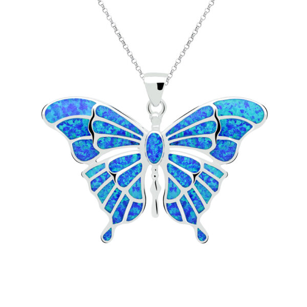 Naszyjnik srebrny motyl niebieski opal. Naszyjnik Motyl z Opalem wykonany ze Srebra Próby 925. Naszyjnik dodatkowo uszlachetniony warstwą rodu. Wielkość Motyla: 40×50 mm. Długość naszyjnika: 50 cm.