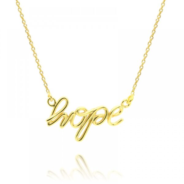 Naszyjnik ozdobiony zawieszką z napisem HOPE- nadzieja , wykonany ze srebra próby 925 oraz pokryty warstwą 24 karatowego złota. Naszyjnik z napisem to doskonała propozycja dla kobiet które poprzez drobną ozdobę chcą wyrazić siebie. Naszyjnik z napisem doda charakteru każdej stylizacji. Szerokość zawieszki 2,5 cm, wysokość zawieszki 1,5 cm. Długość naszyjnika 43-46 cm.