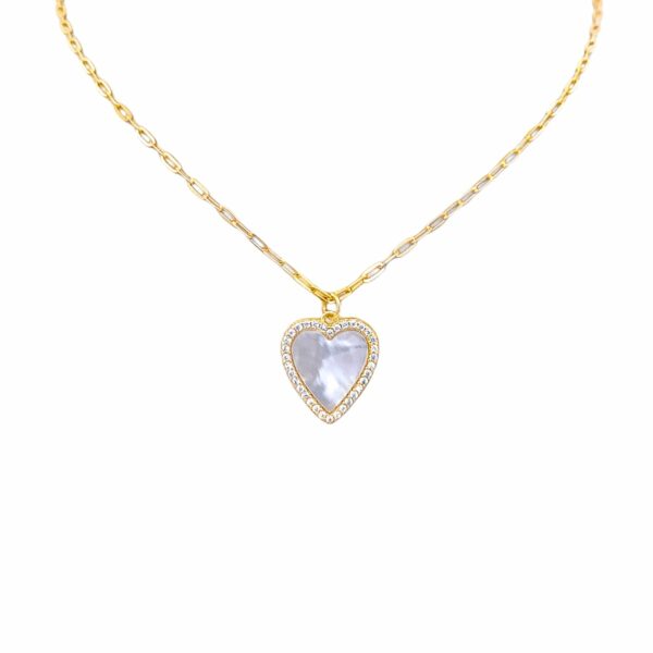 Naszyjnik srebrny pozłacany serce cyrkonie i masa perłowa wykonane z najwyższej próby srebra 925 – bez niklu, nie uczulają..