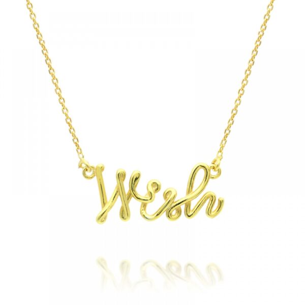 Naszyjnik ozdobiony zawieszką z napisem WISH- życzenie , wykonany ze srebra próby 925 oraz pokryty warstwą 24 karatowego złota. Naszyjnik z napisem to doskonała propozycja dla kobiet które poprzez drobną ozdobę chcą wyrazić siebie. Naszyjnik z napisem doda charakteru każdej stylizacji. Szerokość zawieszki 3 cm, wysokość zawieszki 1,5 cm. Długość naszyjnika 43-46 cm.