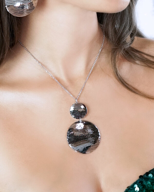 Naszyjnik wykonany z ogromną starannością i precyzją o bardzo nietypowym wzornictwie. Naszyjnik szlifowany metodą diamentową, która nadaje niepowtarzalny blask biżuterii. Naszyjnik Błyszczące Koła wykonany ręcznie przez mistrza sztuki jubilerstwa. Duży Naszyjnik z Diamentowanymi Kołami przepięknie podkreśli charakter każdej stylizacji, nadając jej Kobiecości oraz niepowtarzalnego szyku. Naszyjnik z Kołami jest niezastąpionym dodatkiem, który idealnie dopełni kolekcję Twojej biżuterii.