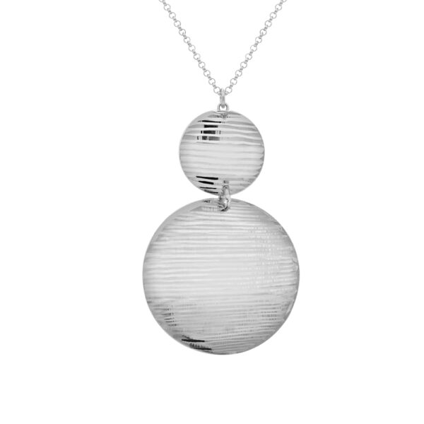Naszyjnik Duży Podwójny Błyszczące Koła wykonany z najwyższej Próby Srebra 925 – bez dodatku niklu, nie uczula. Naszyjnik pokryty 3 warstwami szlachetnego Rodu. Długość naszyjnika: 40-44,5 cm. Wielkość zawieszki: 60×40 mm.