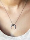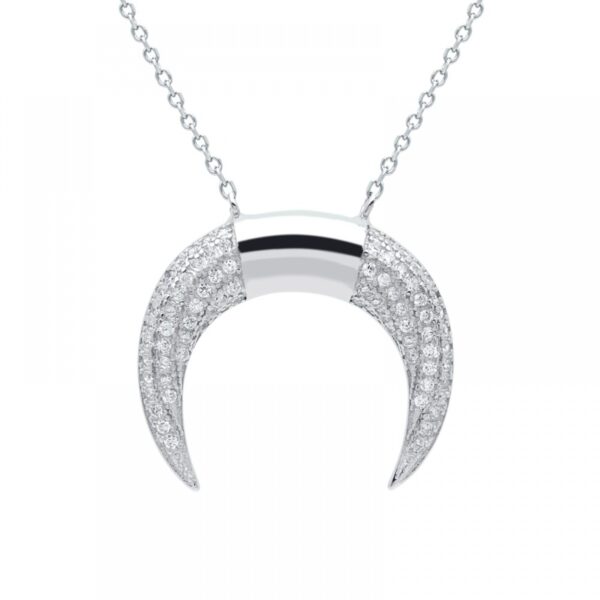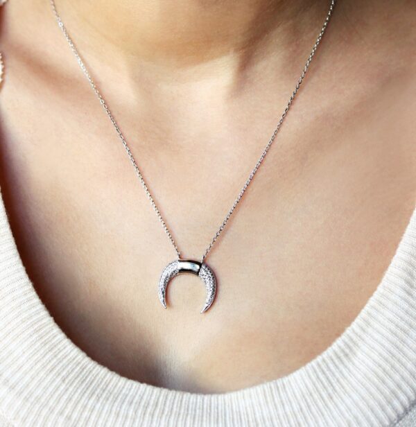 Naszyjnik ozdobiony białą cyrkonią, wykonany ze srebra uszlachetnionego rodem próby 925. Naszyjnik w kształcie księżyca. Wielkość ozdobnej zawieszki: 17×17 mm. Długość naszyjnika regulowana: 42-45 cm.