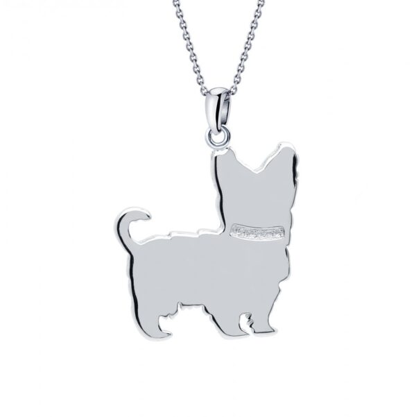 Naszyjnik wykonany ze srebra próby 925, dodatkowo uszlachetniony rodem. Zawieszka w kształcie pieska. Długość naszyjnika 42-44 cm. Wielkość zawieszki około 20×20 mm.
