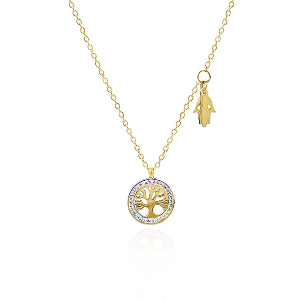 Naszyjnik z drzewkiem szczęścia i ręką Fatimy złoty stal szlachetna