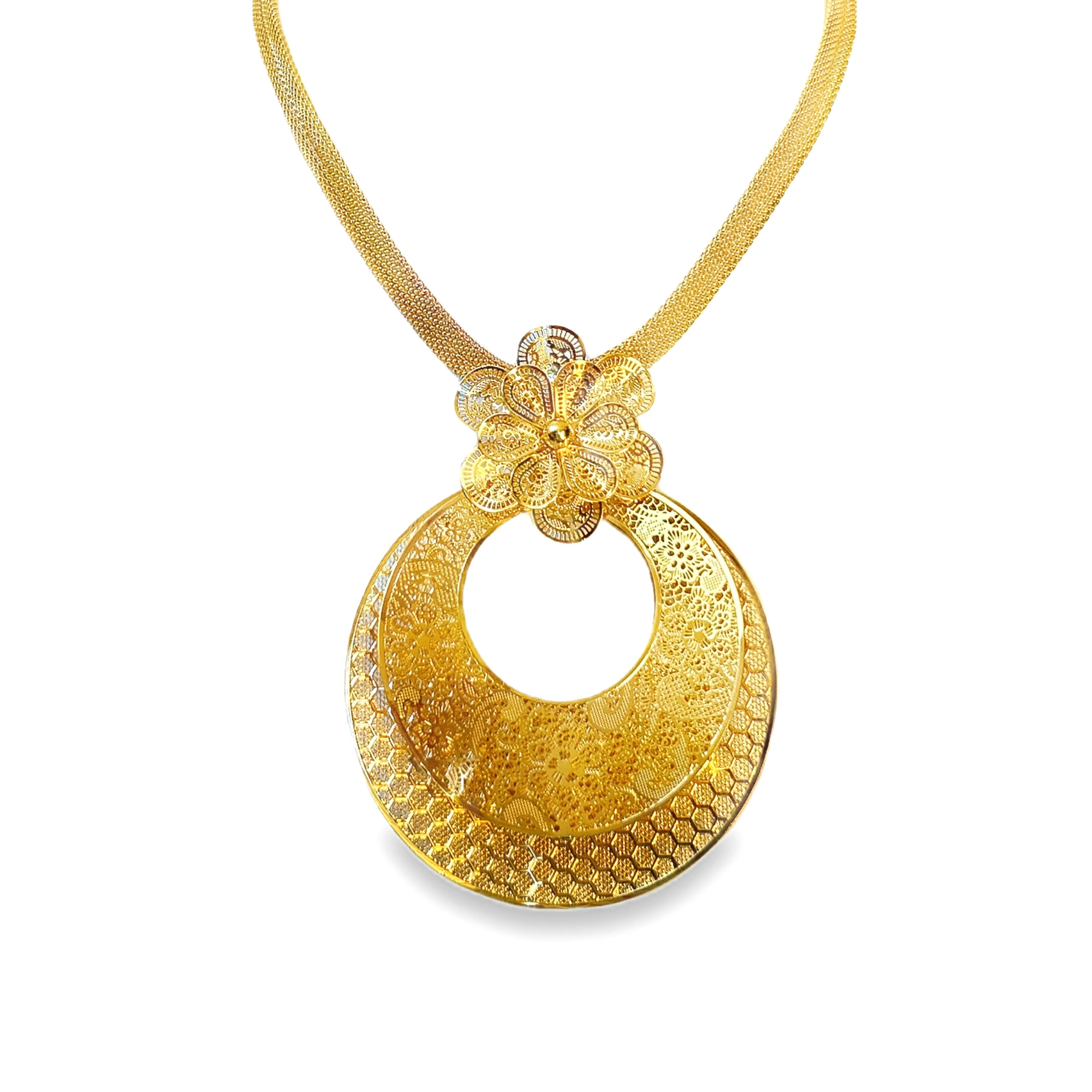 Ten wyjątkowy naszyjnik ze stali szlachetnej pozłacanej to biżuteria, która łączy delikatność z odważnym stylem. Duży, ażurowy kwiat osadzony na okrągłej zawieszce zachwyca misternymi zdobieniami, które pięknie odbijają światło i nadają całości luksusowego charakteru.