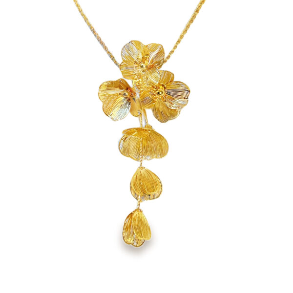 Ten zachwycający naszyjnik z wiszącą kwintesencją kobiecej elegancji i romantyzmu, wykonany z pozłacanej stali szlachetnej, prezentuje kunsztownie odwzorowany motyw kwiatów, które układają się w delikatną, a zarazem efektowną kaskadę. Każdy płatek zdobi subtelna faktura przypominająca naturalne żyłkowanie, co nadaje biżuterii lekkości i trójwymiarowości.