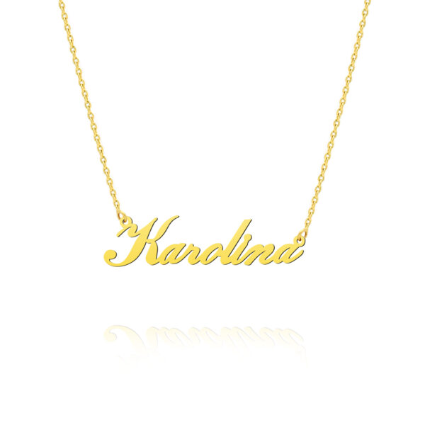 Naszyjnik z imieniem KAROLINA srebrny pozłacany wykonany z najwyższej próby srebra 925 – bez dodatku niklu, nie uczula. Naszyjnik pokryty 3 warstwami 24 karatowego złota. Naszyjnik o splocie typu ankier regulowany o długości od 40 do 45 cm. Splot ankier jest jednym z najmocniejszych splotów, odpornym na zerwanie oraz uszkodzenia. Zawieszka z imieniem KAROLINA o wymiarach 11x46mm o gładkiej, błyszczącej powierzchni, która ślicznie odbija światło. Wyrób jubilerski wysokiej jakości wykonany przez mistrzów jubilerstwa z ogromną precyzją oraz dbałością o detale.