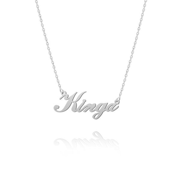 Naszyjnik z imieniem KINGA srebrny wykonany z najwyższej próby srebra 925 – bez dodatku niklu, nie uczula. Naszyjnik pokryty 3 warstwami szlachetnego rodu. Naszyjnik o splocie typu ankier regulowany o długości od 40 do 45 cm. Splot ankier jest jednym z najmocniejszych splotów, odpornym na zerwanie oraz uszkodzenia. Zawieszka z imieniem KINGA o wymiarach 11x35mm o gładkiej, błyszczącej powierzchni, która ślicznie odbija światło. Wyrób jubilerski wysokiej jakości wykonany przez mistrzów jubilerstwa z ogromną precyzją oraz dbałością o detale.