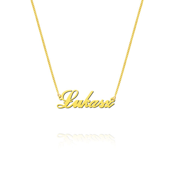Naszyjnik z imieniem ŁUKASZ srebrny pozłacany wykonany z najwyższej próby srebra 925 – bez dodatku niklu, nie uczula. Naszyjnik pokryty 3 warstwami 24 karatowego złota. Naszyjnik o splocie typu pancerka regulowany o długości od 46 do 51 cm. Splot pancerka jest bardzo mocnym splotem, odpornym na zerwanie oraz uszkodzenia. Zawieszka z imieniem ŁUKASZ o wymiarach 11x34mm o gładkiej, błyszczącej powierzchni. Wyrób jubilerski wysokiej jakości wykonany przez mistrzów jubilerstwa z ogromną precyzją oraz dbałością o detale.