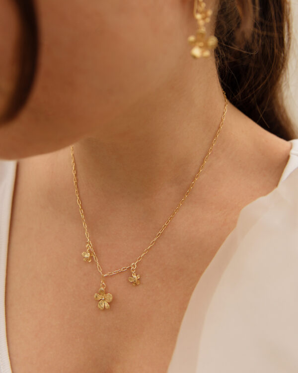 Każdy z trzech kwiatuszków został ozdobnie diamentowany, co dodaje naszyjnikowi subtelnego, migoczącego efektu i eleganckiego wykończenia. To srebrny naszyjnik pozłacany, który łączy lekkość z elegancją – idealny zarówno na co dzień, jak i na wyjątkowe okazje.